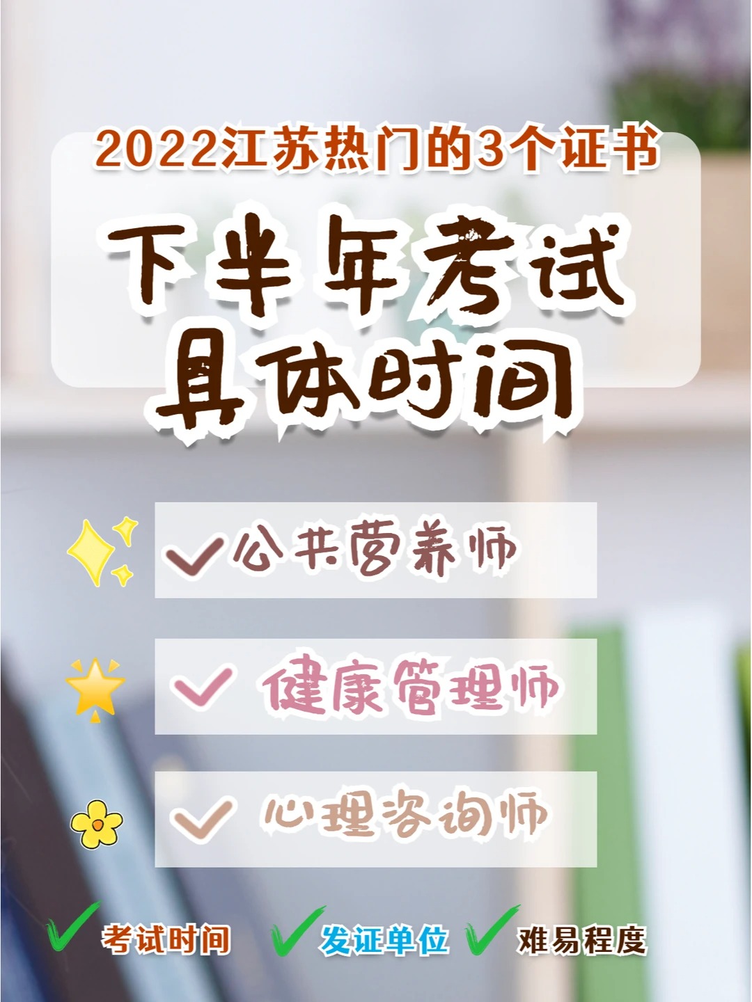 现在报考学习,年底就可以拿到证书🌈而且这3个证书很热门🔥仅江苏1个省,每场考试规模都在几W人以上! - ✅ 报考条件不高 年龄要求:年🈵18周岁的成年人即🉑 学历要求:健康管理师和心理咨询师要求大专以上,营养师高中以上学历即可 - ✅ 学习周期 2-3个月即🉑学完。 在职的上班族👨🔧全职妈妈🙋♀️刚毕业的大学生利用业余时间学习,学完课程即🉑报名参加考试! - ✅ 证书含金量高,前景好🌻 ‼️紧缺型工种:进入小康社会,在满足物质🥪的基础上,大家更关注身心健康🏥健康管理师、营养师、心理咨询师社会需求旺盛! - ‼️正规权威发证:公共营养师和健康管理师是人社指定的第三方社会机构发证📜心理咨询师是中科院权威发证 - ‼️薪资待遇不错💰有2-3年行业经验后,月薪可以过W
