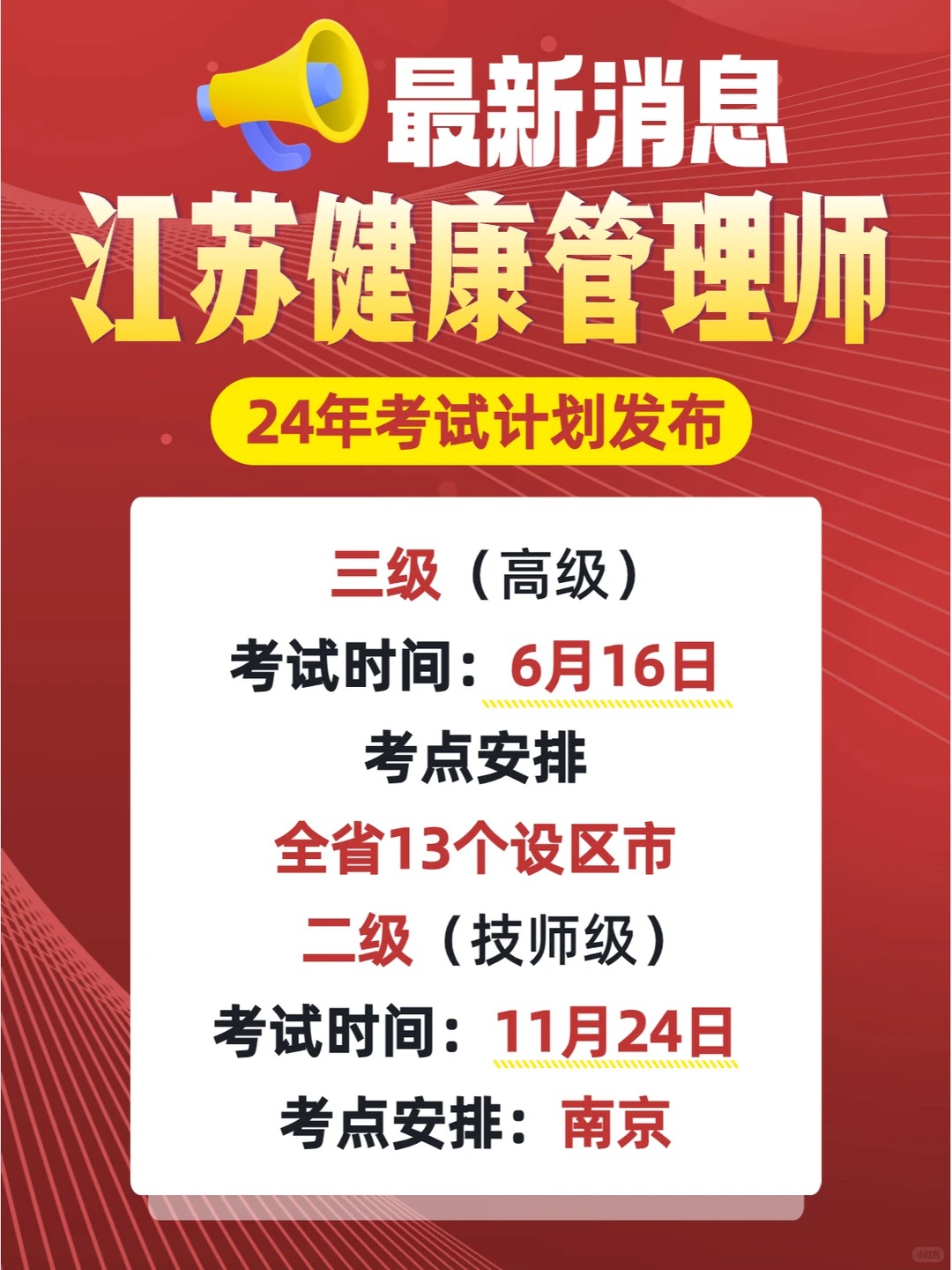 🚩1.31江苏预防医学会发布2024年技能等级认定考试计划!! 📢正式公布【24年健康管理师】考试时间和考点,详细安排如下👇👇 . ✅健康管理师三级(高级) ⭕考试时间:2024年6月16日 ⭕考点安排:全省13个设区市 ✅健康管理师二级(技师级) ⭕考试时间:2024年11月24日 ⭕考点安排:南京 . ✅报考条件 1️⃣医药卫相关专业 2️⃣10年以上相关职业 🚩更多报考详情💬